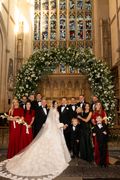 After a whirlwind tour of London’s bridal boutiques with her small team of helpers – mum Tana and her youngest brother, two-year-old Jesse – the bride ultimately found the wedding dress of her dreams at Elie Saab. “I knew I wanted to wear something very traditional and quite modest, with lace,” she says. “I’ve always loved Grace Kelly and Kate Middleton’s gowns: that beautiful high neckline, super feminine.” The moment she turned to the mirror wearing the Elie Saab she was “totally obsessed with it” she says, smiling. “It makes me feel very princess-like.” With the addition of a lace veil, Amina Muaddi heels (“a Christmas present from Adam last year”), and a shell-shaped Chanel minaudière (a limited-edition 2016 piece the bride managed to track down online), all the elements for a dazzling entrance to the abbey were in place.